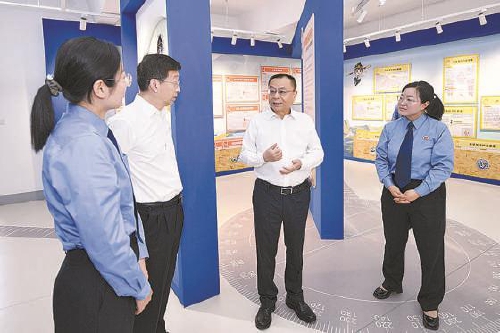 江苏省检察院党组书记、检察长赵铁实(右二)调研淮安市检察院“法话西游”体验馆之“知规守矩”法治实境课堂。