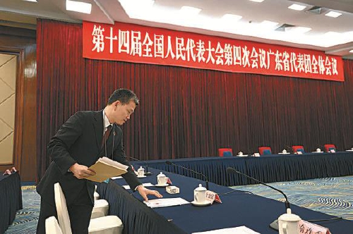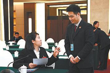 图②:3月11日,十四届全国人大四次会议江西代表团举行全体会议。会议间隙,最高检列席旁听工作人员将代表建议回信送到全国人大代表温善连手中。