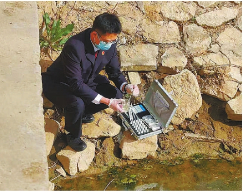 河北省秦皇岛市北戴河新区检察院干警利用快速检测设备对官道沟河道水质进行检测。