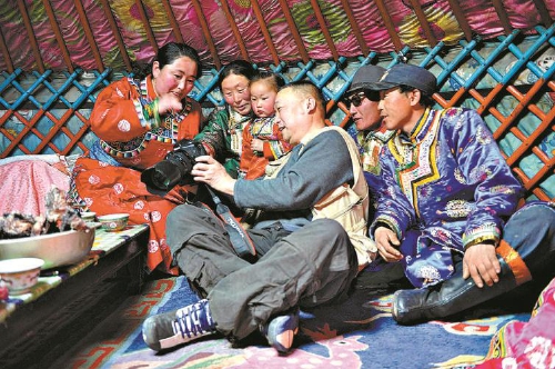 退休后,赵如意踏上了草原骏马拍摄之路。图为他(手持相机者)和牧民一同欣赏镜头下的牧区生活。丁丁摄